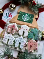 This set includes 1/2 dozen holiday themed mug hugger cookies. Cookies will be individually heat sealed and packaged in a bakery box with a ribbon/bow and festive tag. A gift card of your choice can be added. Either way, this set is a great way to send someone holiday cheer!!